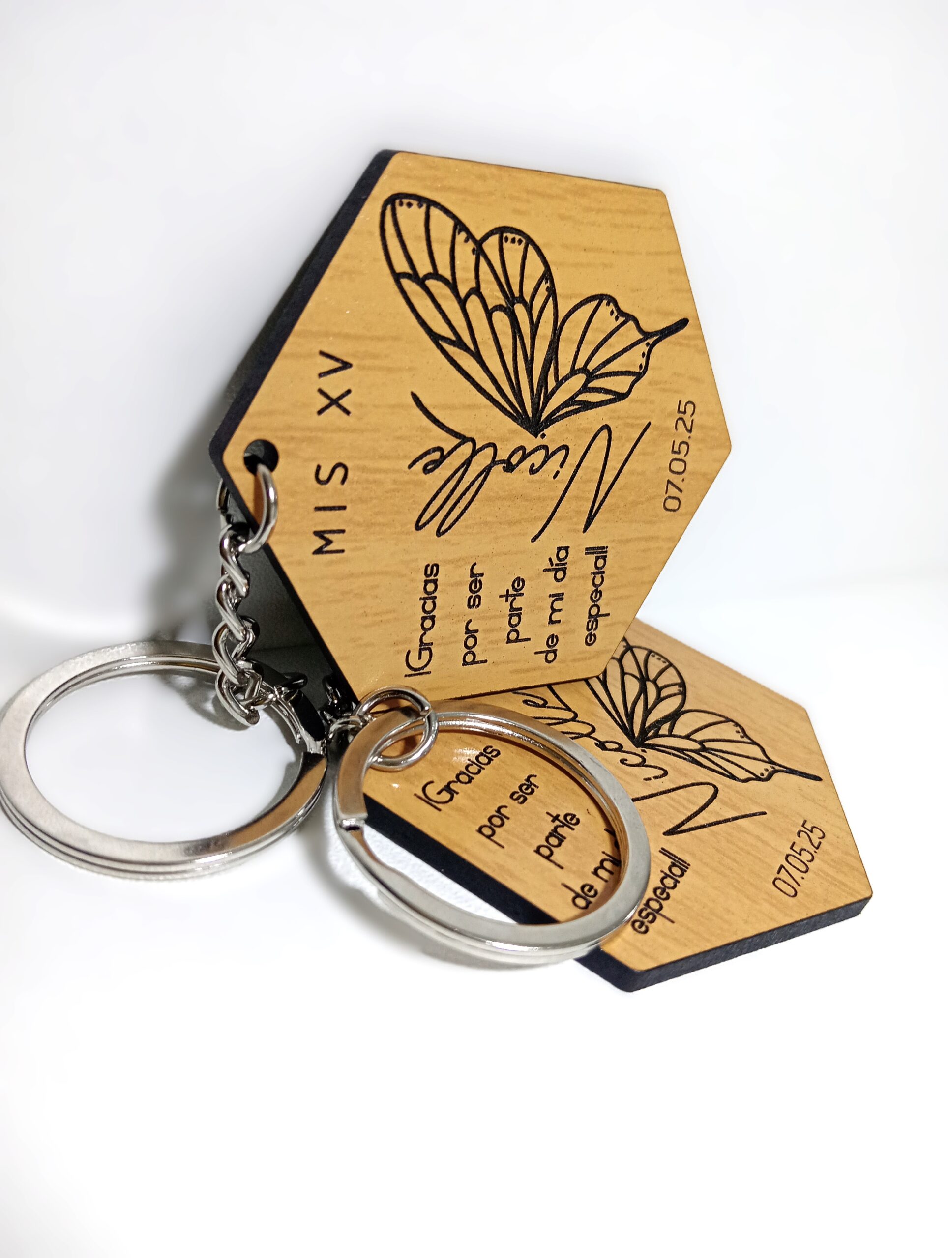 Llavero hexagonal en MDF de 2.8 mm con diseño de mariposa para 15 años. Corte y grabado láser profundo, ideal como recuerdo elegante para invitados.