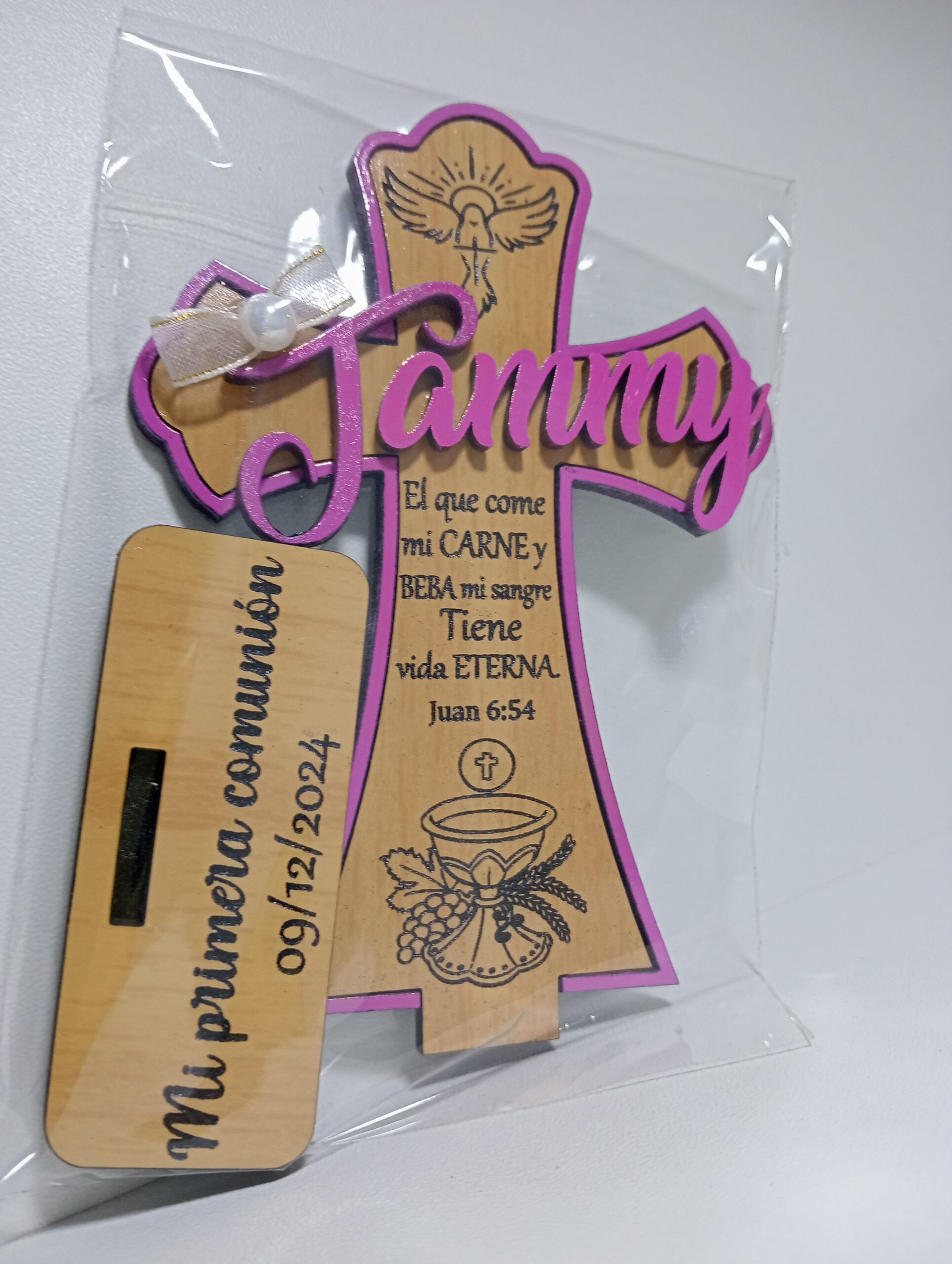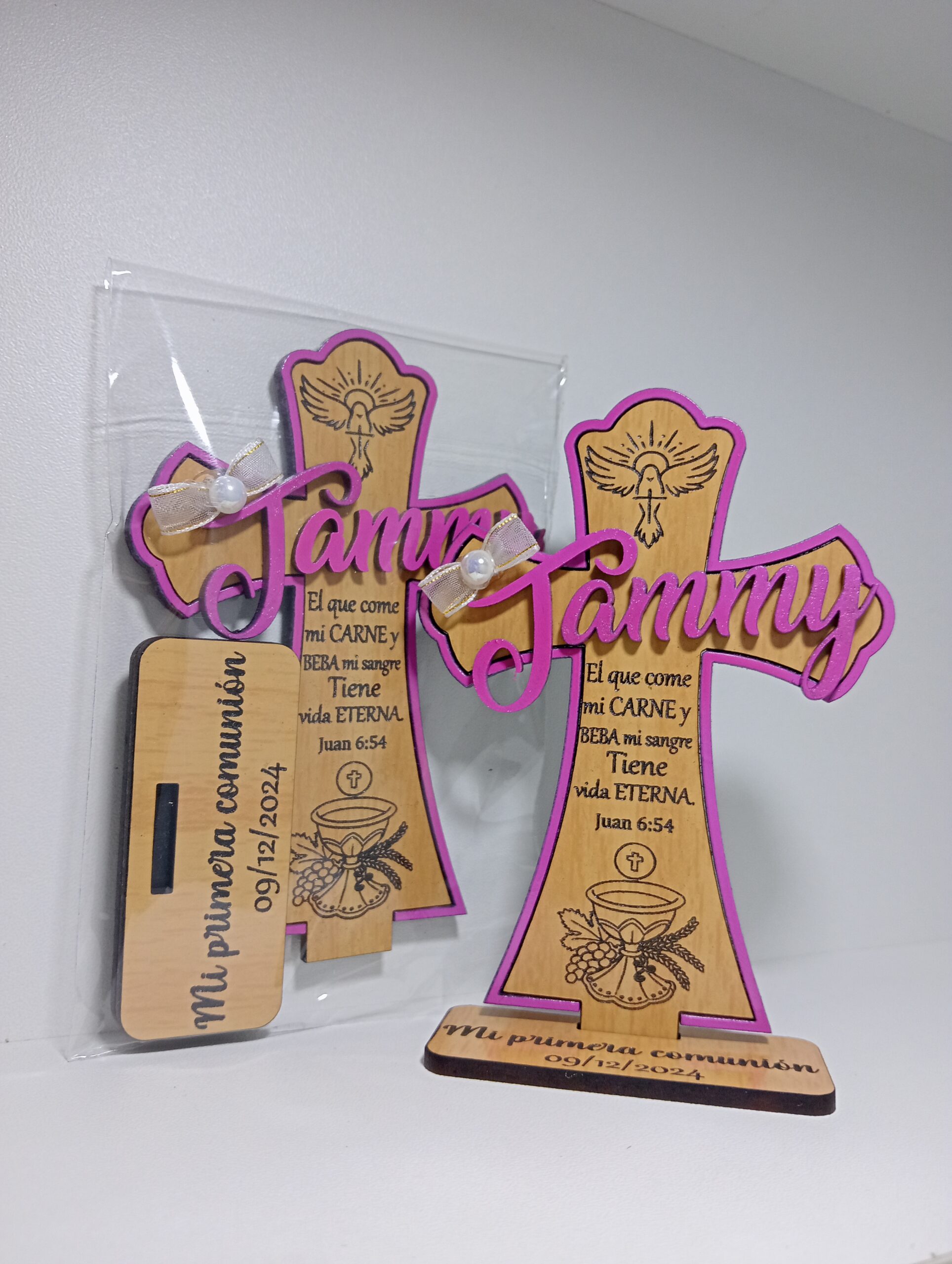Recordatorio de Primera Comunión personalizado, elaborado en MDF Durolac de 2.8 mm, con acabado fino y diseño en forma de cruz. Incluye grabado láser profundo de alta calidad, detalles decorativos a color y una base estable para colocar en escritorios, repisas o mesas.
