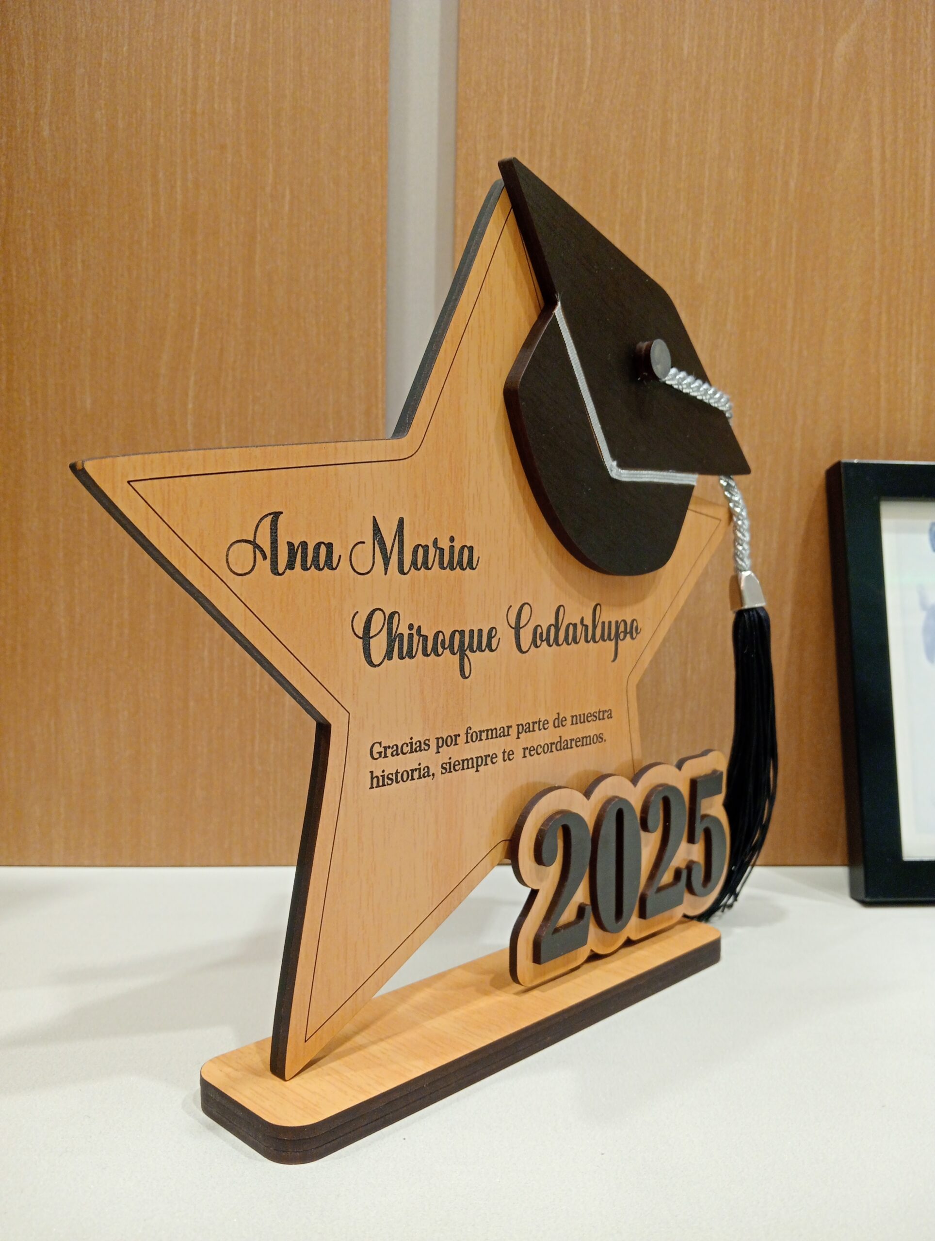 Celebra la culminación de un importante logro con nuestro Recordatorio Estrella de Graduación, fabricado en MDF laminado premium y diseñado para convertirse en un recuerdo duradero y significativo.