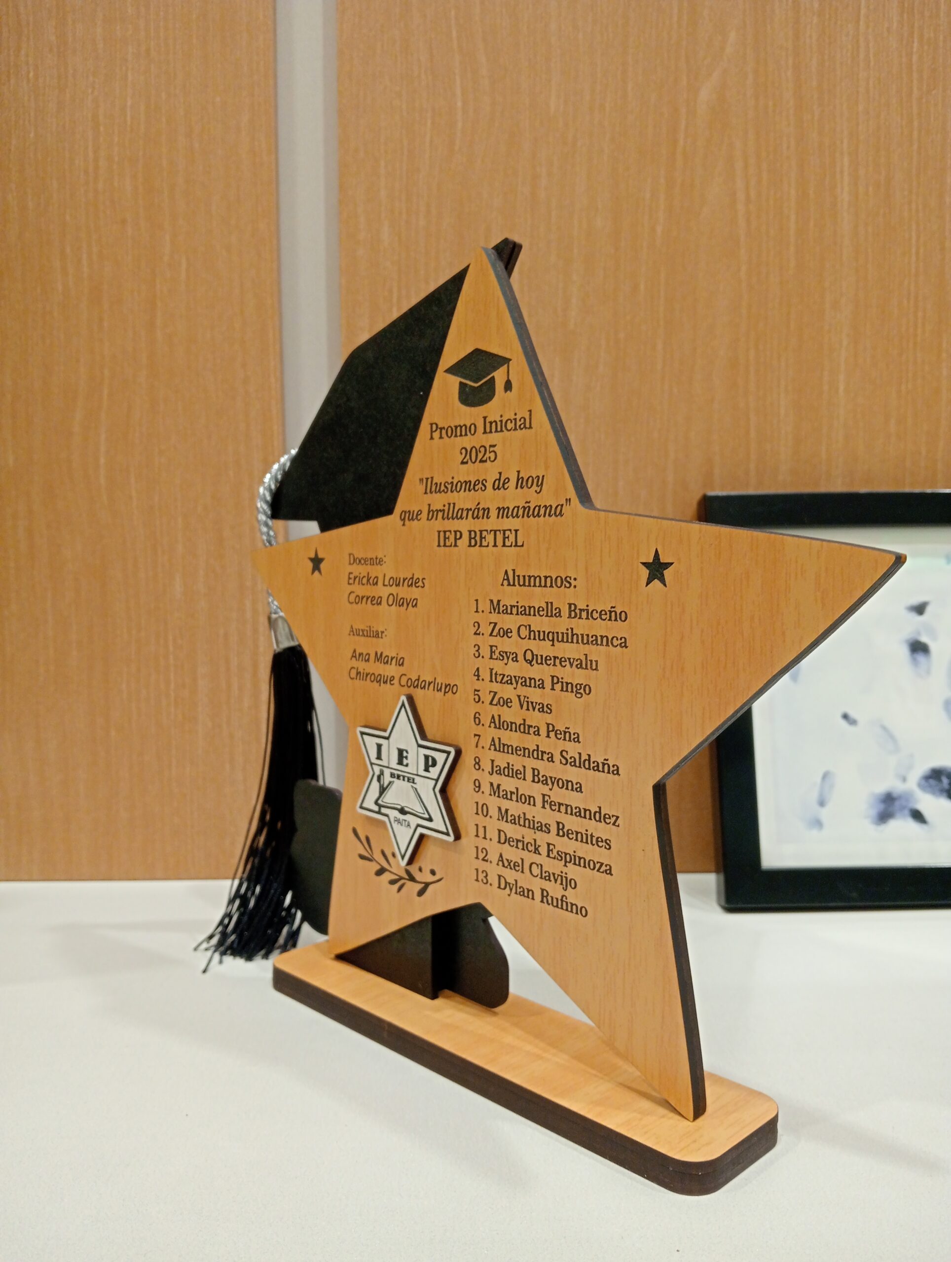Su forma de estrella representa el brillo y esfuerzo de cada estudiante, mientras que su diseño en capas y el grabado láser a dos caras permiten una presentación elegante y totalmente personalizable. Puedes añadir nombres, frases, colegio, docentes o la lista completa de alumnos en el reverso.